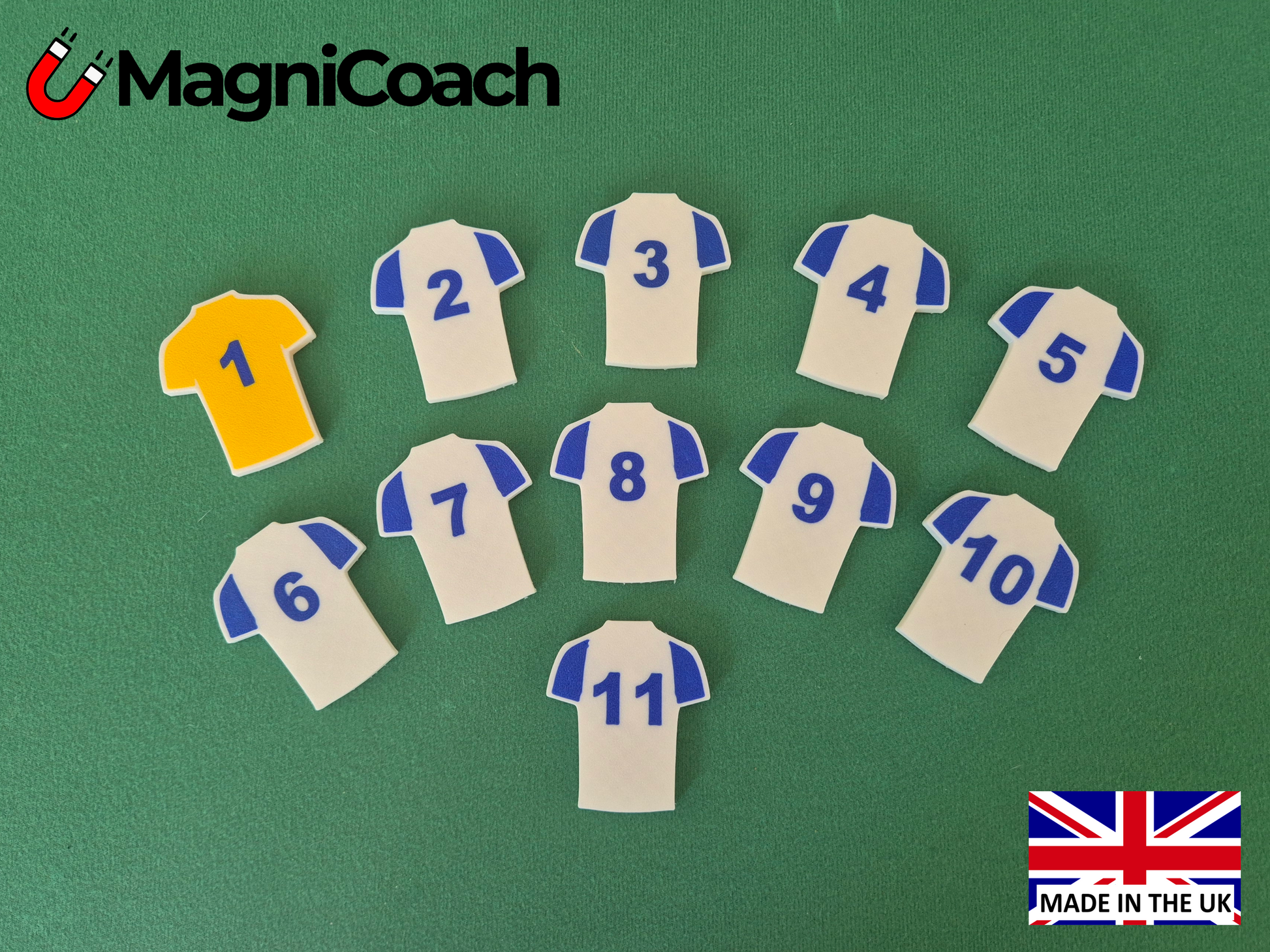 Bring clarity and professionalism to your coaching sessions with the MagniCoach Football Shirt Set available in different sizes to suit pitch side or dressing room team/tactic talks (Small (35mm), Medium (60mm) and Large (90mm)). Designed for coaches who want a clean, effective way to demonstrate tactics, formations, and match-day plans, this set features 11 magnetic shirt-shaped markers in a bold colour scheme.