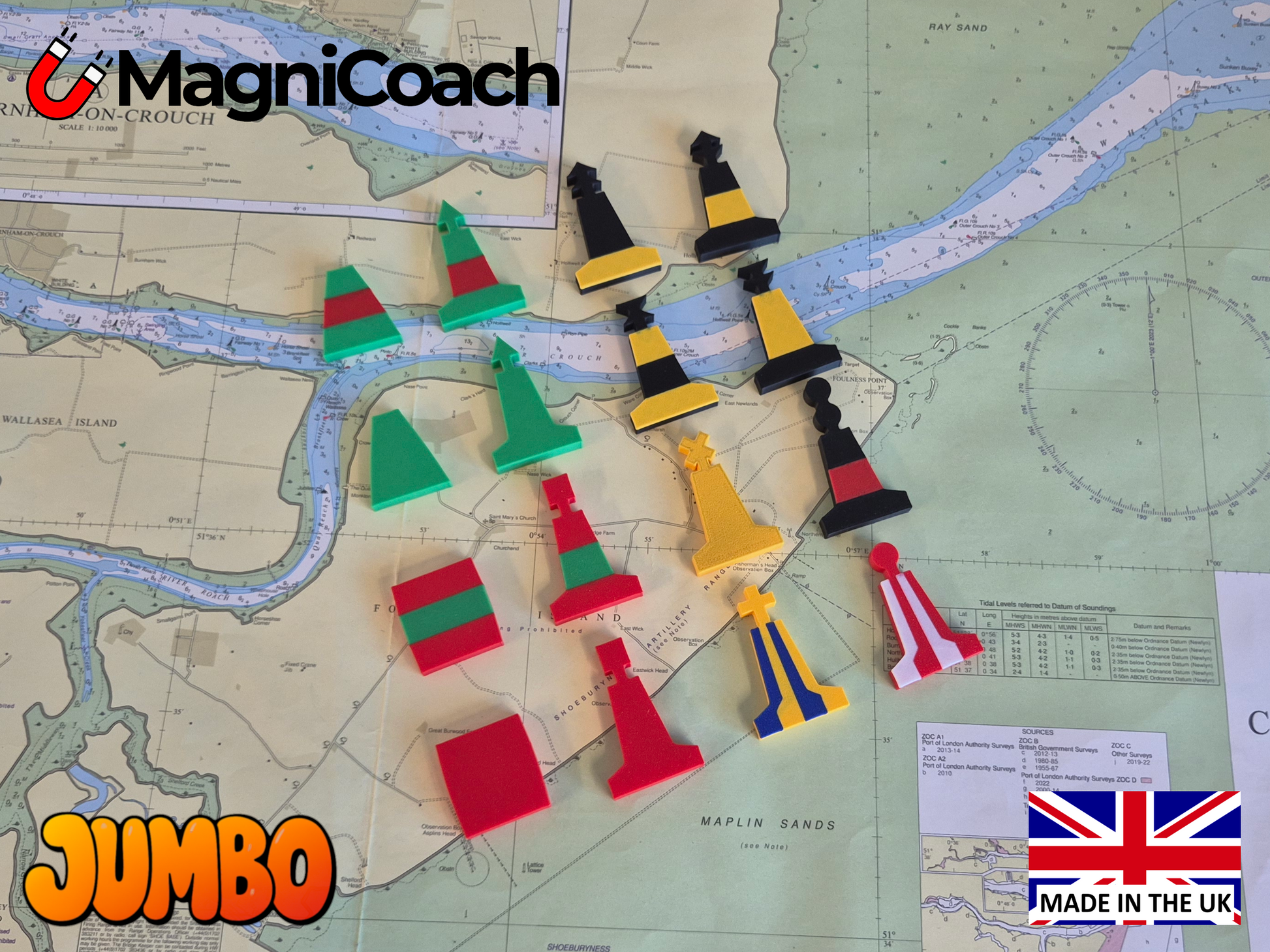 Bring clarity to the classroom with this advanced navigation training set of Jumbo Flat IALA marks. Featuring (60mm**) North, South, East, and West Cardinal marks, Isolated Danger, Safe Water, New Danger, and a Special Mark plus eight IALA (A) channel marks as a 2D magnetic marker. This jumbo set is ideal for teaching the buoyage system used to indicate safe water and shipping. These teaching aids are ideal for magnetic/white boards in a classroom or larger setups to deliver clear, bold visuals and perfect for explaining danger areas, tidal streams, and route planning.
