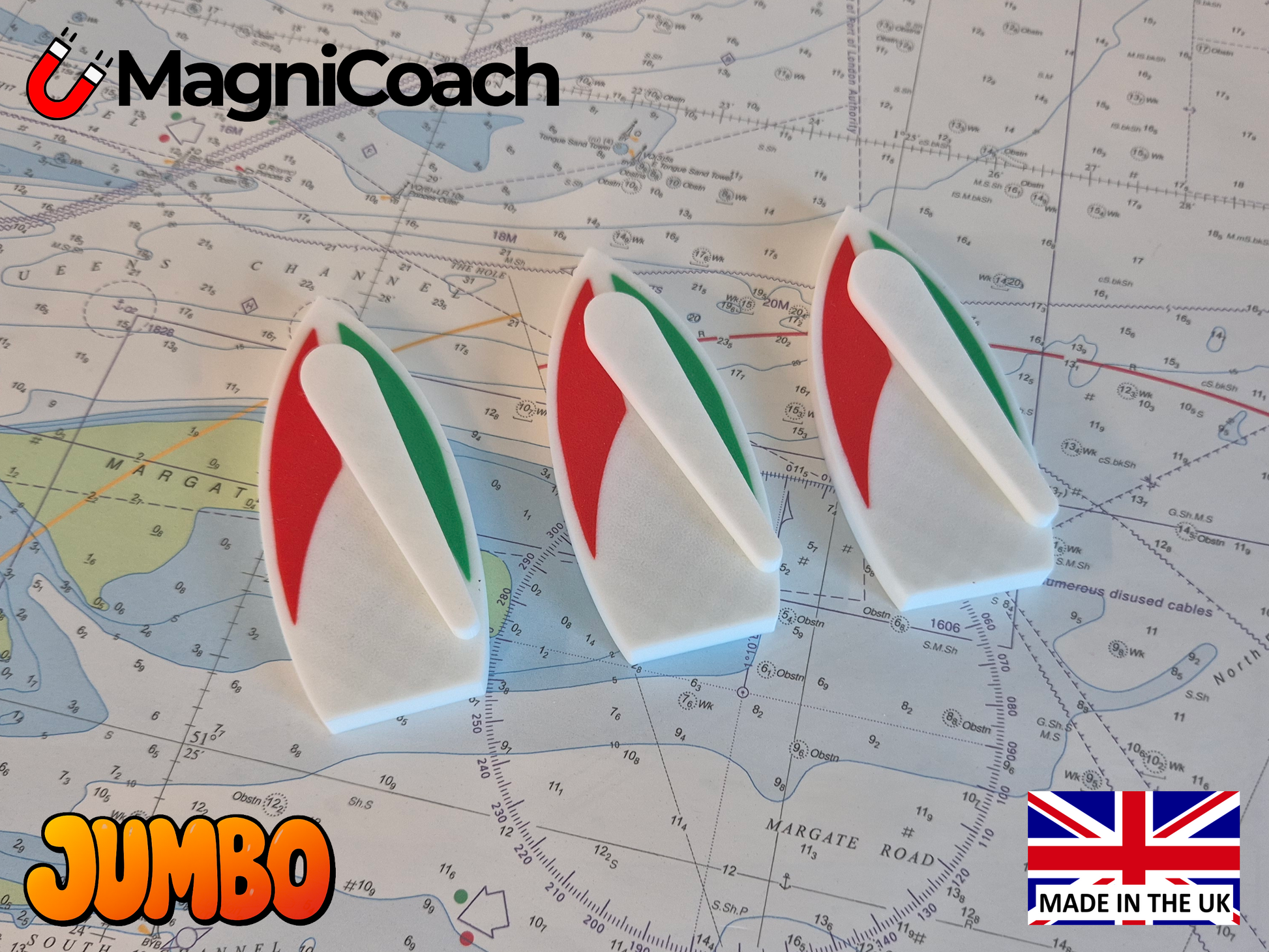Bring clarity to your right-of-way and collision rule demonstrations with this set of 3 Jumbo (100mm) magnetic dinghies, each featuring clearly marked port and starboard sides. These boats are invaluable when teaching the Racing Rules of Sailing and simulating real-world incidents.