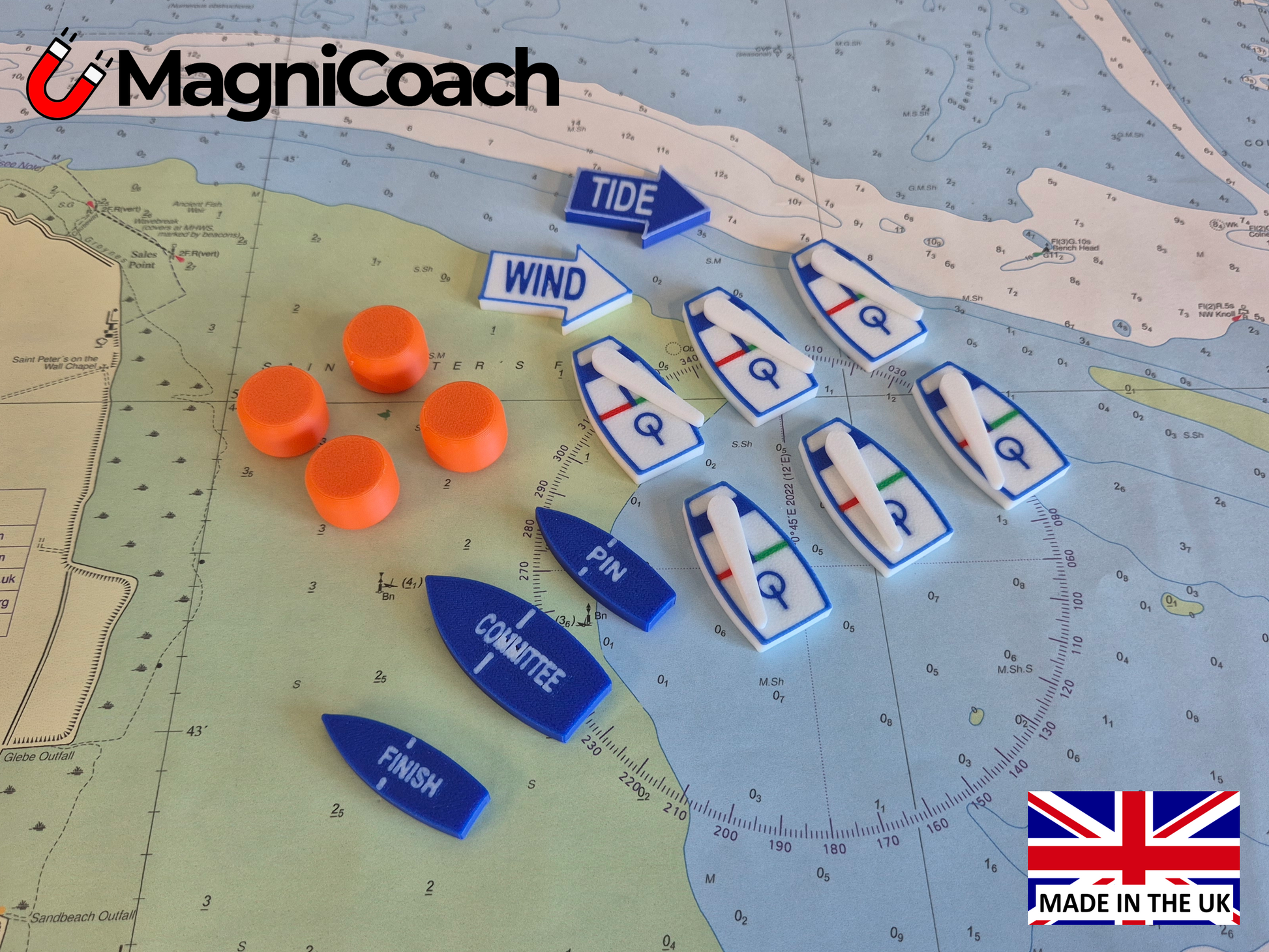 Enhance your sailing instruction with these compact magnetic Optimist boats and buoys, designed for teaching dinghy sailing. Each 35mm-long Optimist features port and starboard markers to indicate right of passage, aiding in the demonstration of collision regulations. The movable sails allow instructors to visually explain points of sail for each leg of the course. Small enough to fit in your pocket, they are also invaluable for protest hearings, helping sailors and officials visualize incidents with clarity. A must-have tool for sailing coaches, instructors, and race officials alike.