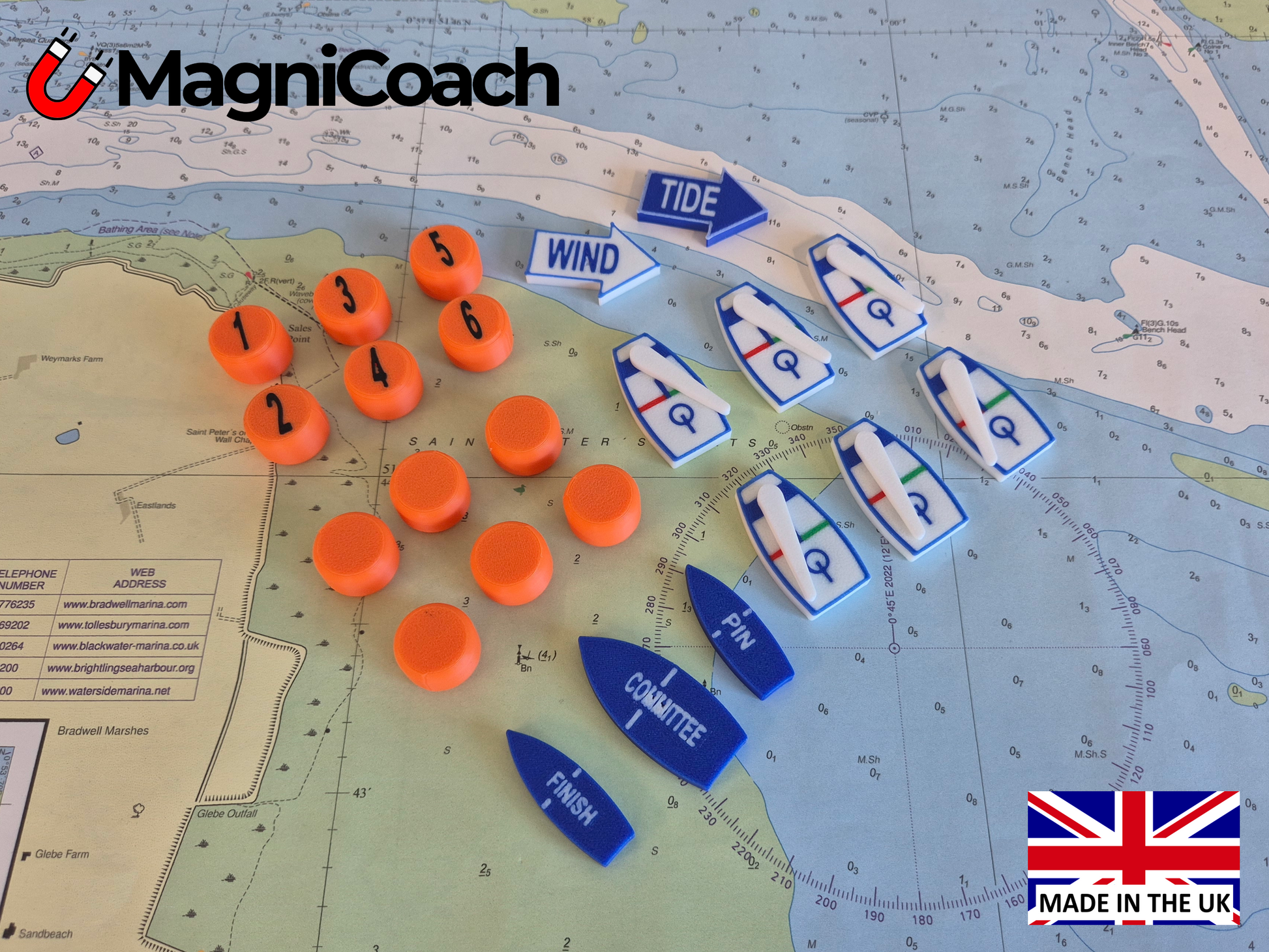 Enhance your sailing instruction with these compact magnetic Optimist boats and buoys, designed for teaching dinghy sailing. Each 35mm-long Optimist features port and starboard markers to indicate right of passage, aiding in the demonstration of collision regulations. The movable sails allow instructors to visually explain points of sail for each leg of the course. Small enough to fit in your pocket, they are also invaluable for protest hearings, helping sailors and officials visualize incidents with clarity. A must-have tool for sailing coaches, instructors, and race officials alike.