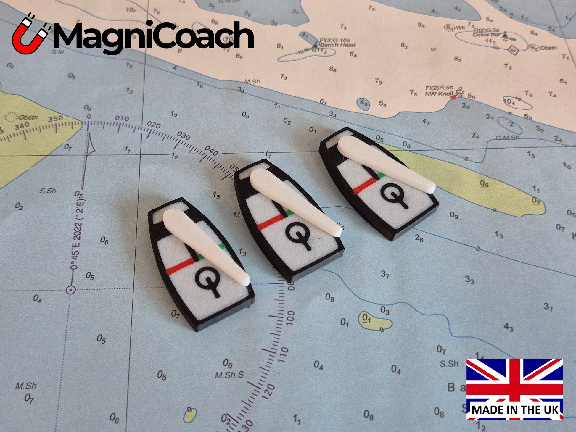 Each boat is magnetic and designed for use on whiteboards and metal coaching surfaces — ideal for fleet management exercises, beginner sail training, and visualising start sequences or team racing drills.