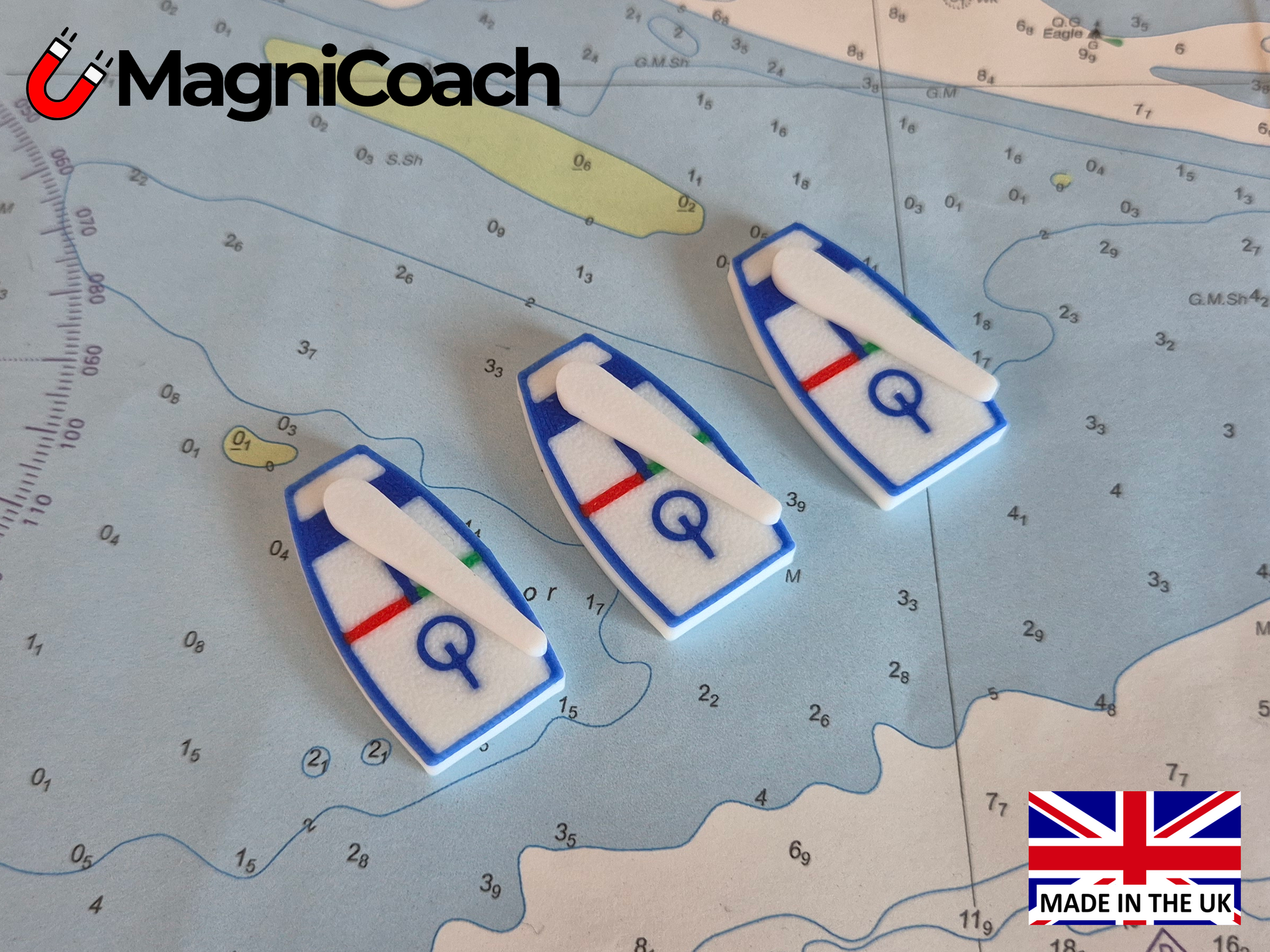 Each boat is magnetic and designed for use on whiteboards and metal coaching surfaces — ideal for fleet management exercises, beginner sail training, and visualising start sequences or team racing drills.